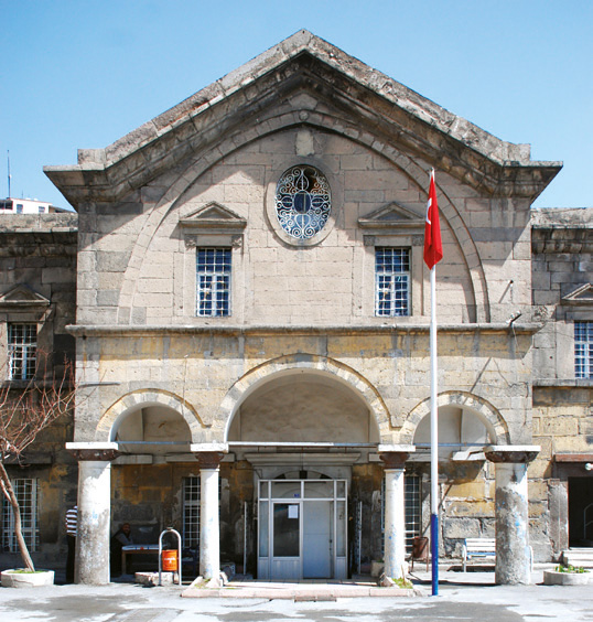 Yapının, dört sütuna oturan üç kemerin oluşturduğu iki katlı giriş mekânı (narteks) dikkat çekmektedir.